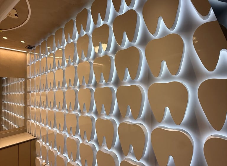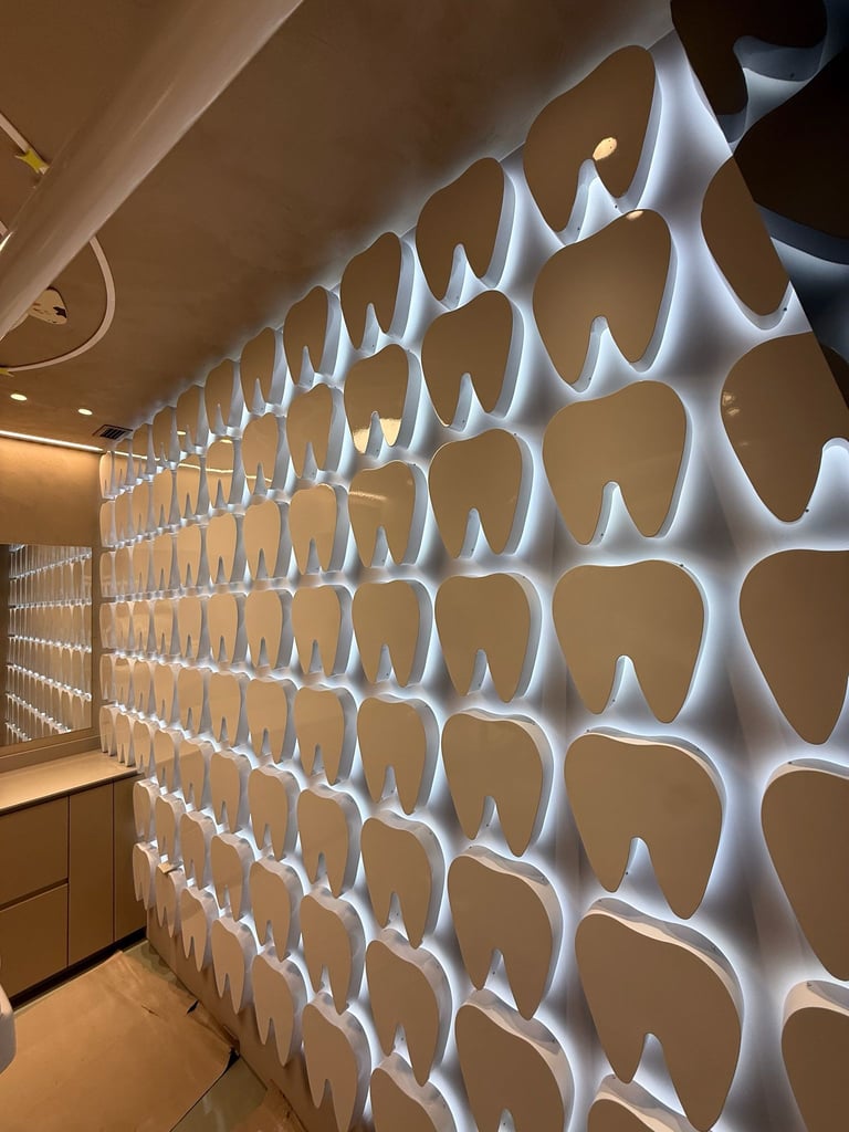 Decoração de parede com formas de dentes em monobloco, alumínio pintado, com luz indireta